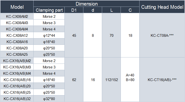 Internal Cutting Head Dimension Chart