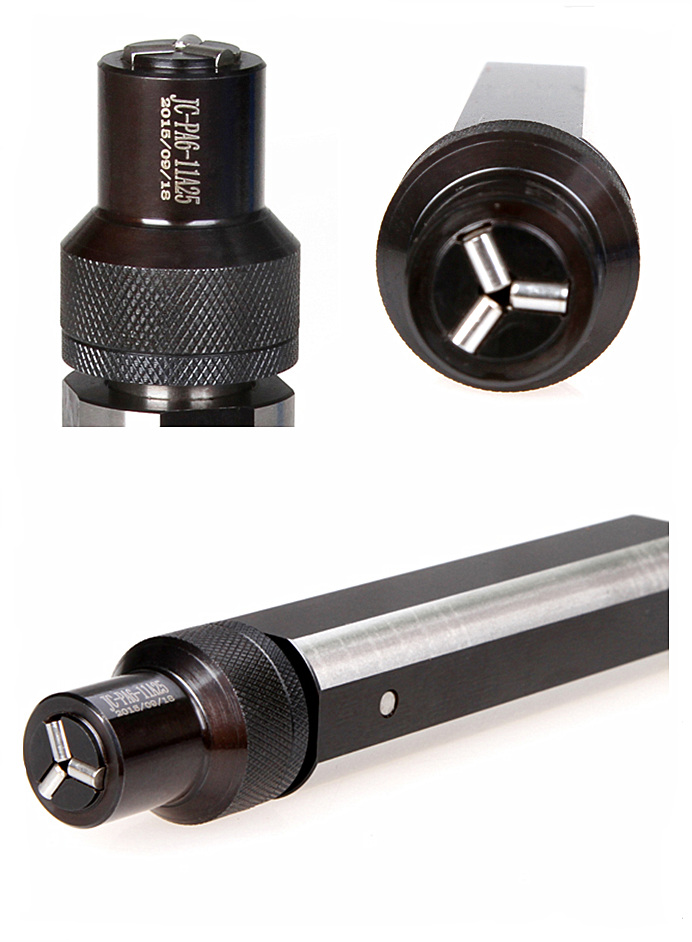 本工具壓力裝置設(shè)計在裝夾柄內(nèi)部,可極大的縮短滾壓頭伸出距離,較適合有行程限制的機床上平面滾壓加工。